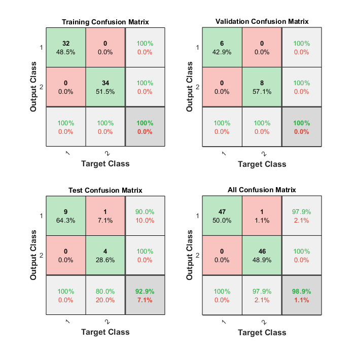 Classification was done by training a neural network in MATLAB and implementing the network on the STM32. The idea was to extract the important features of the PSD's and feed these features into a neural network. As brain waves fall into distinct frequency bands (4-8Hz for theta, 9-13Hz for alpha, 14-30Hz for beta, 30Hz and above for Gamma) the first thought was to extract an average magnitude within these frequency bins, and these magnitudes would then be fed into a neural network for classification. This is essentially what we did, and the results of one of the initial networks trained is shown below. After retraining the model several times, eventually a high accuracy network was found. Only a two layer network was needed to classify with high accuracy. By doing feature extraction, a more complex network was not needed. The final step was to implement everything in C on the H7 nucleo board. This wasn't too difficult, as the rough framework was already done in MATLAB.