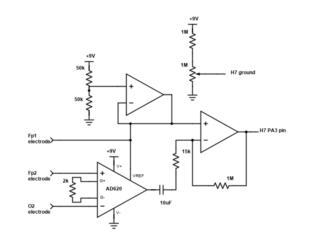 This was achieved by first using a simple analog amplifier stage (shown in the figure above) that provided a gain of around 1000 (brain waves are on the order of 10uV, extremely small), and then feeding the output of this amplifier into an H7 nucleo board. In the context of this project, one "channel" constituted three electrodes. Two electrode inputs were fed into a differential amplifier, while the third electrode was used as a ground reference. The electrode placements were also just as important. In the next section this will be explained in more detail. In practice, a sampling rate of around 160Hz would be sufficient to satisfy Nyquist theorem (as the most interesting brain waves happen between 0-80 Hz) although for this project a sampling rate of 2kHz was chosen.