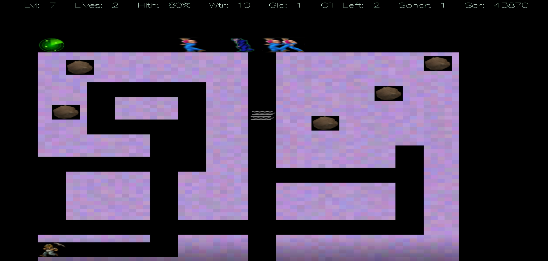 This was the final project for a C++ class I took. The goal is to tunnel through the earth and find all of the buried treasure. Enemies will populate and attack with varying levels of speed. Different items such as weapons and health packages will randomly appear during gameplay.
