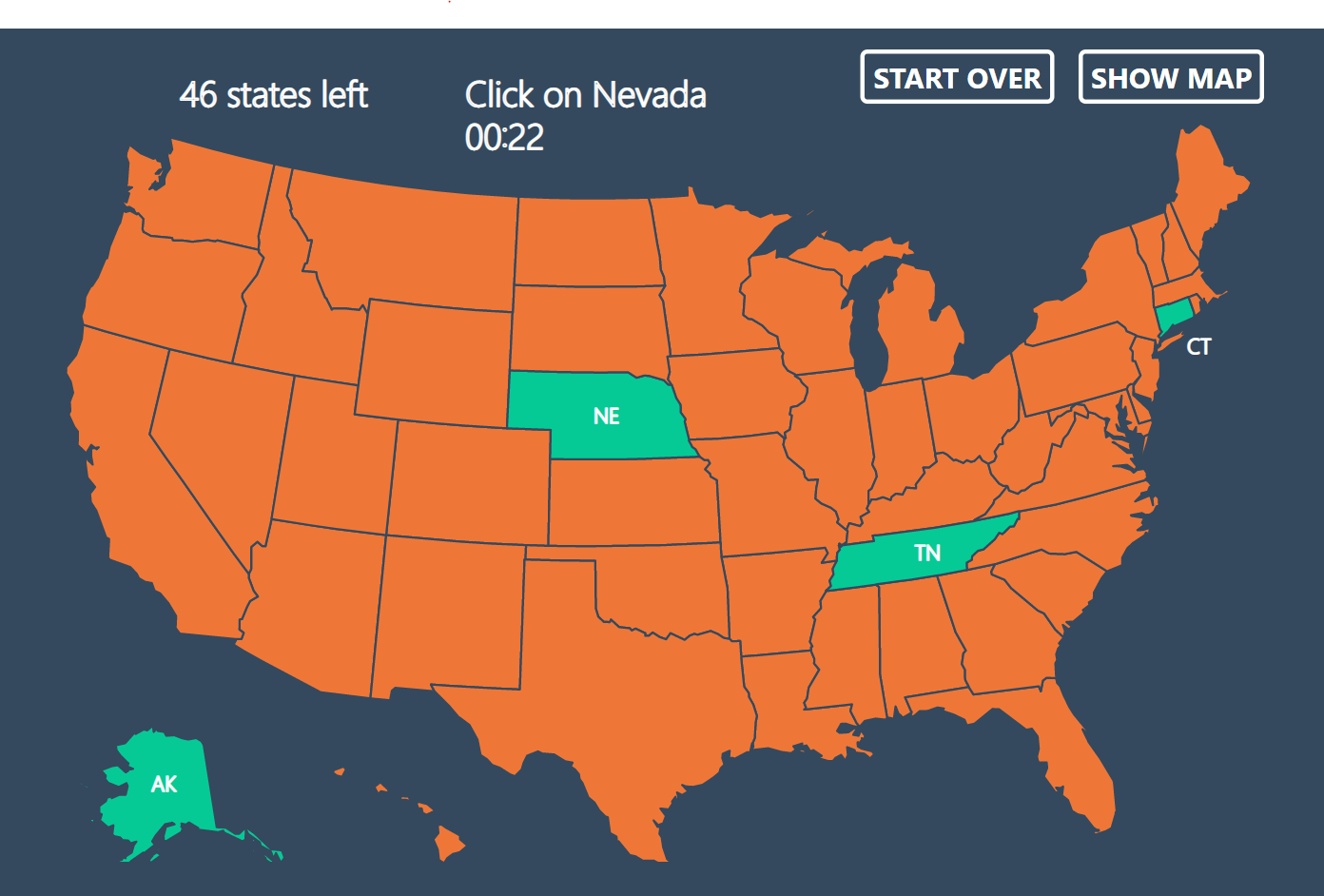 An interactive web application written in JavaScript that tests users on their U.S. geography. I used an SVG grid for the map, and then it was as simple as attaching event listeners to each state. Try it out