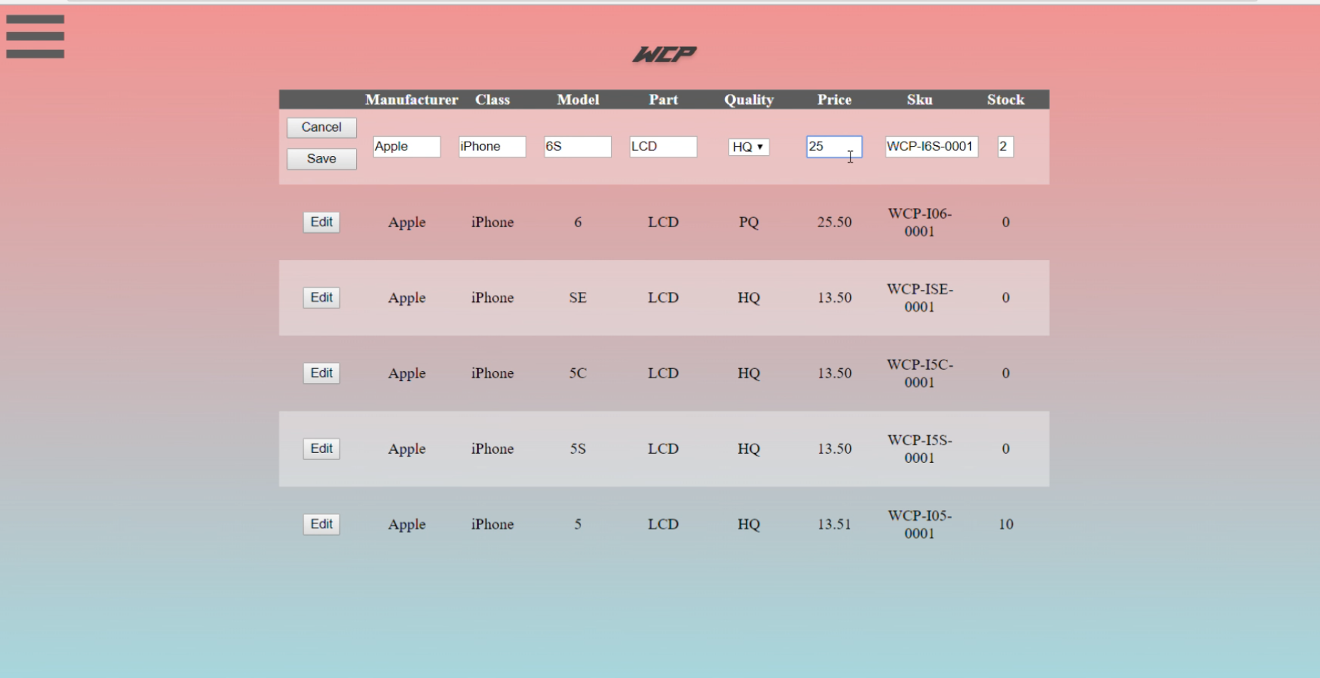 I developed this web app specifically for a cellphone repair parts site. The backend was written in PHP and SQL. In addition, the app has AJAX functionality so updates to any fields can be made without a page reload.